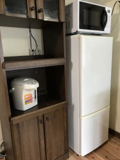 冷蔵庫・電子レンジ![]() 電気ポットやコップや食器なども揃っています。 |
